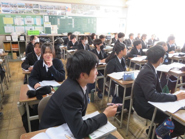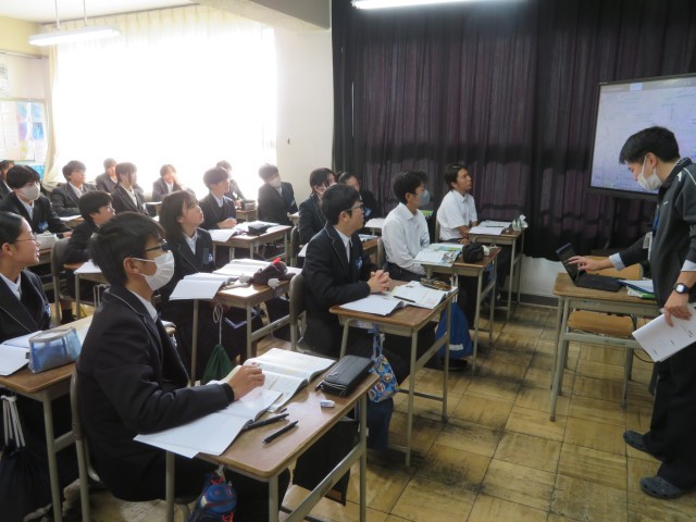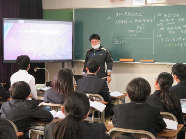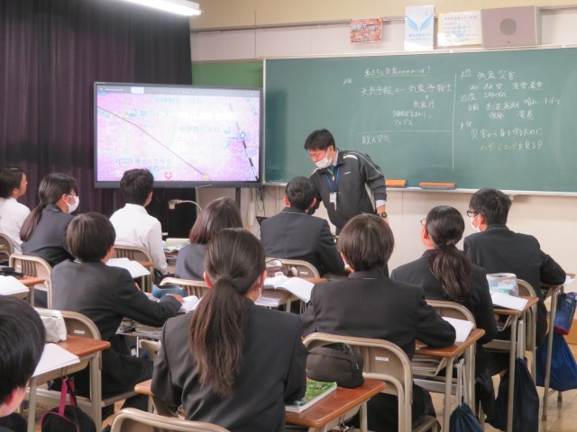 2年生の理科の授業のようすです。「私たちと気象のかかわりについて考えよう」というめあてで学習を進めていました。ハザードマップを見ながら、降水量が多い場合にどのあたりに危険があるか確認していました。気象を予測する力はみんなの命を守ることにつながることがわかりましたね。