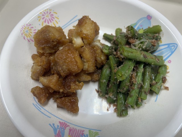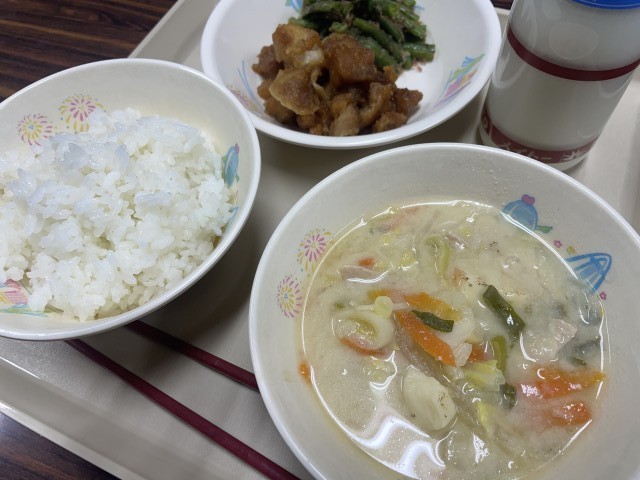 今日の給食のメニューは、ご飯、牛乳、とり肉のはちみつじょうゆがらめ、いんげんのおかか和え、一宮野菜の豆乳なべでした。