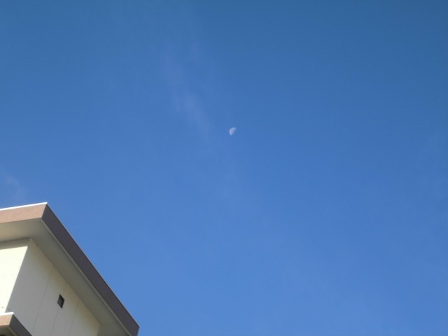 おはようございます。澄み渡る青空のなか月が見られました。今日の月は更待月(ふけまちづき)と言って、月の出が夜更けまで遅くなるため、「夜が更けるまで待つ」という意味合いからつけられました。月周期の第6段階でもあり、満月と下弦の月の間に起こります。この満ち欠けは、月の照度は低くなることを表しており、その後、下弦の月まで、照らされる範囲が徐々に狭くなっていきます。3年生の天体の学習では下弦の月を勉強しましたが間もなくその下弦の月になります。朝見える月でもあるので、天気の良い朝は空を眺めて学習を振り返ってみてください。