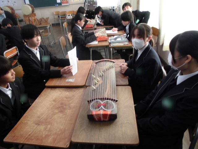12月の音楽の授業のようすです。和の弦の響きを感じながら演奏を楽しんでいましたね。どんな曲が弾けるようになったかな。