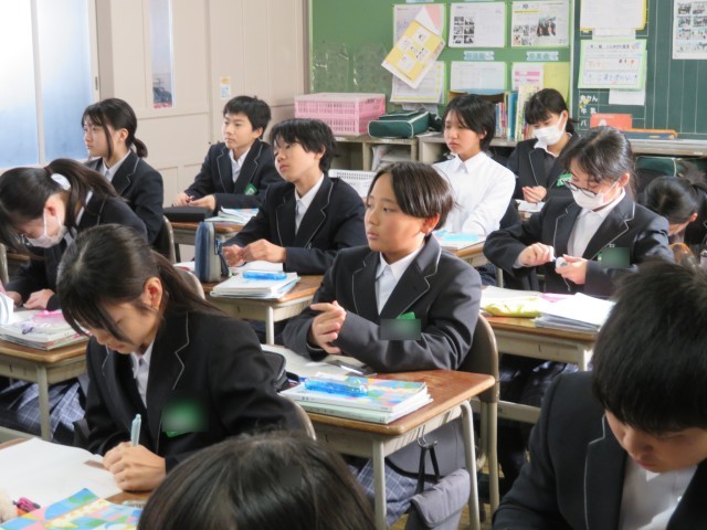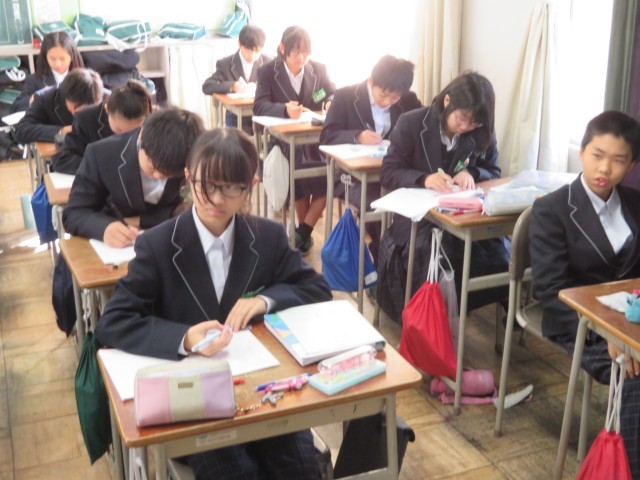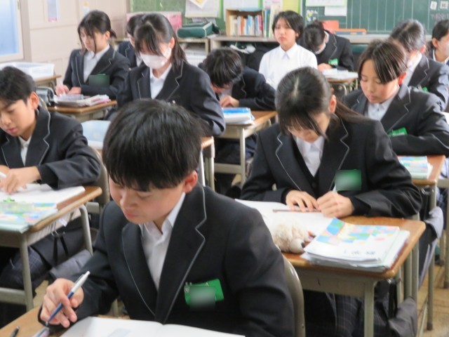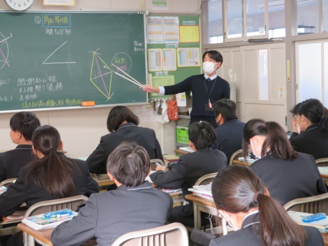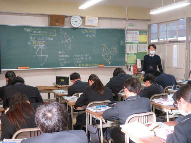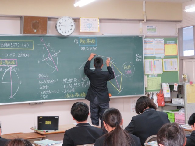 1年生の昨日の数学の授業のようすです。「作図の基本をマスターしよう」というめあてで学習を進めていました。定規とコンパスを使って、垂直な線や角の二等分線の作図のしかたを学びました。どうしたら課題の線を引けるのか、なぜ作図ができるのか考えながらていねいに作図できましたね。