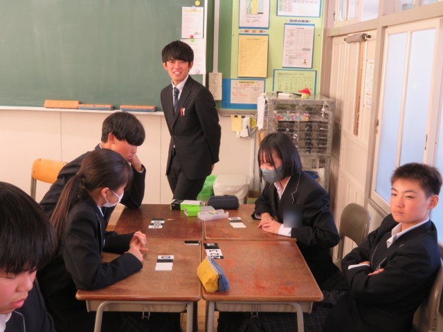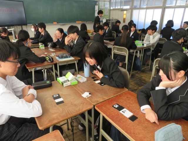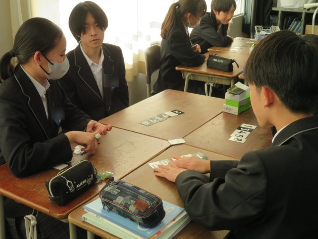 2年生の一昨日の数学の授業のようすです。授業の後半の時間を使って「ひらめきと推理 頭がよくなるゲーム」のアルゴベーシックというカードゲームをして、楽しみながら頭の回転を鍛えていました。