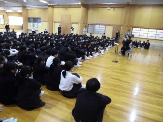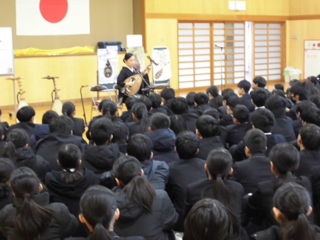 2年生は武道場で筑前琵琶の演奏を聴きました。なかなか聴くことができない琵琶の音色に耳を傾けながら、とても素晴らしい時間を過ごすことができました。