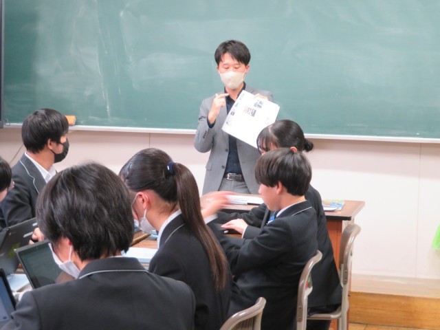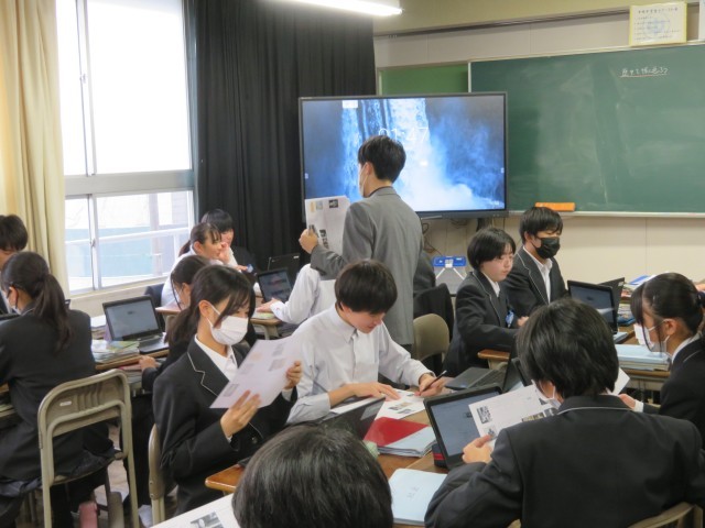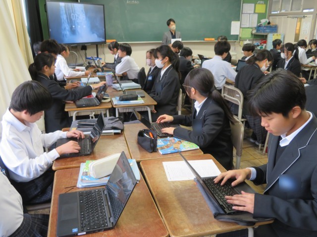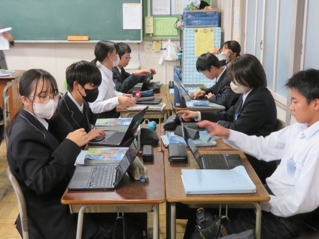 2年生の社会の授業のようすです。「歴史問題プリントに挑戦しよう」というめあてで学習を進めていました。自分でじっくり考えて不確かな部分は、グループで協力したり検索したりして正答にせまっていきました。