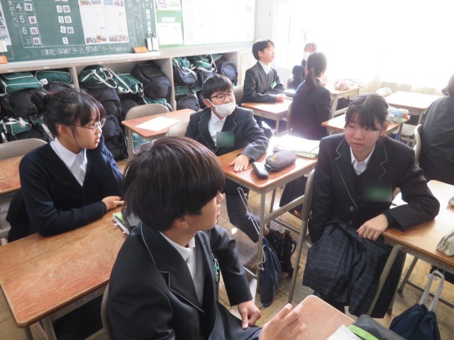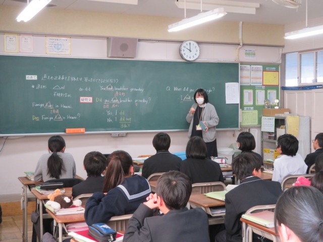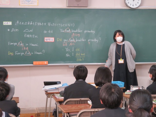 1年生の英語の授業のようすです。「過去のことをたずねたり、答えたりできるようになろう」というめあてで学習を進めていました。