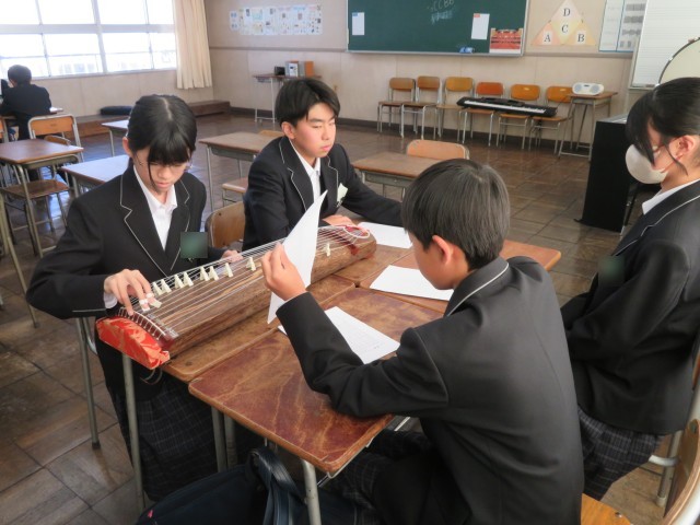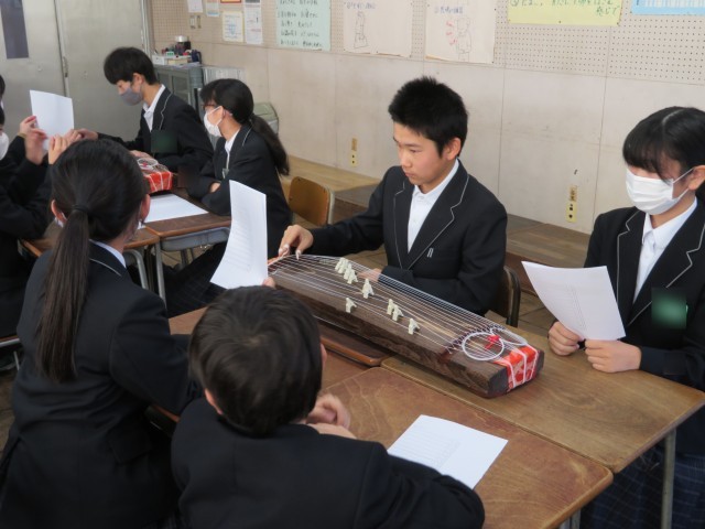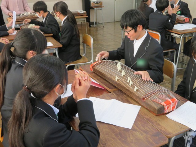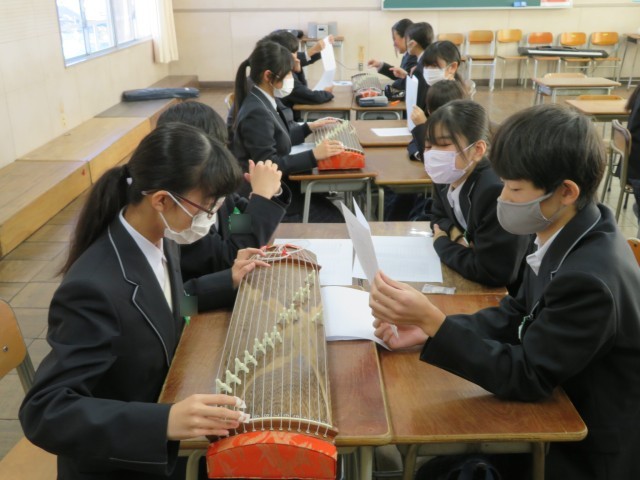 1年生の音楽の授業のようすです。教科担任の先生に合わせて、筝曲「さくらさくら」の演奏に挑戦していました。和の音色が音楽室に響いて心地よかったですね。