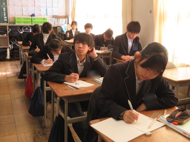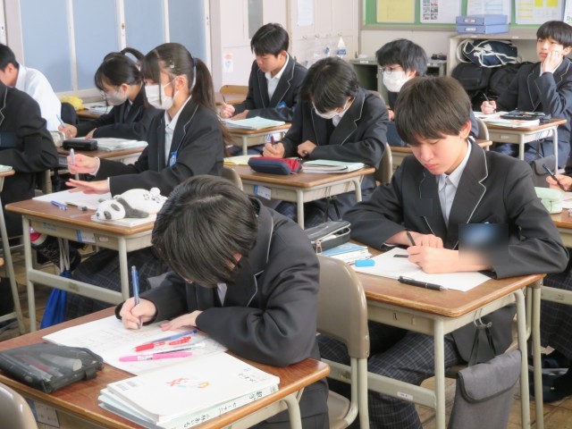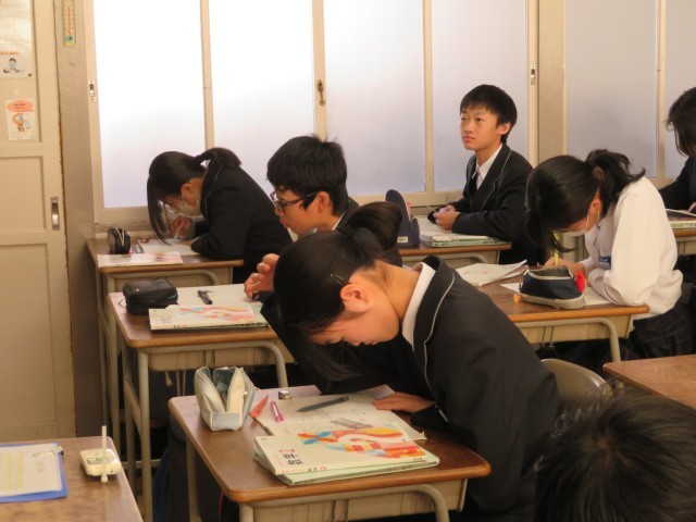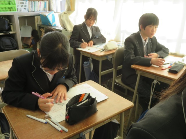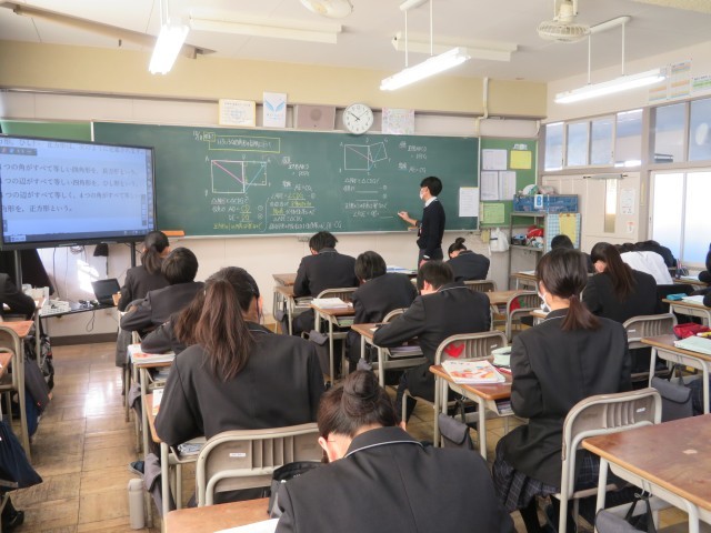 2年生の数学の授業のようすです。「いろんな四角形の証明にトライしよう」というめあてで学習していました。大小2つの正方形を並べた図や、それを共通な頂点で回転させた図の中にできる合同な三角形について証明を考えていました。思考の流れをつかむことができましたね。