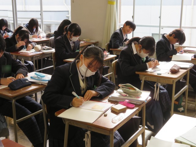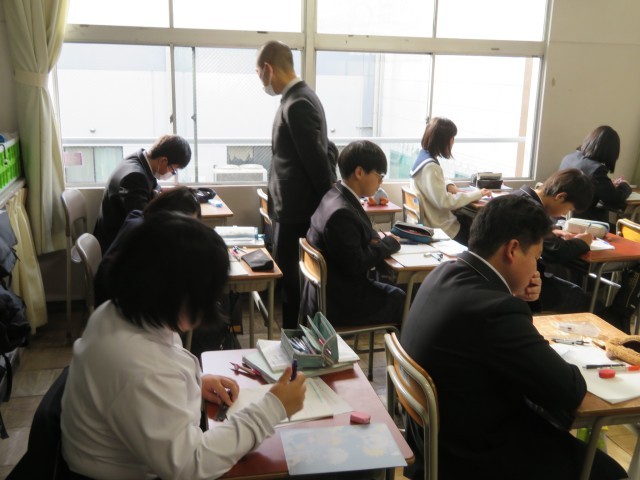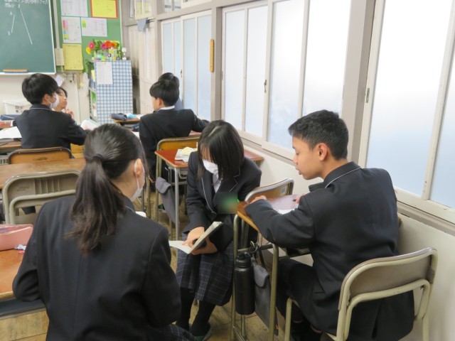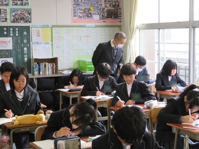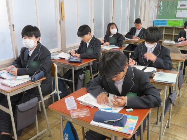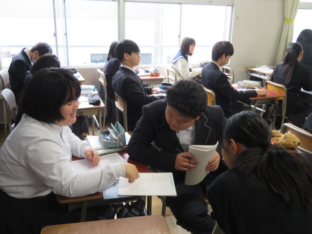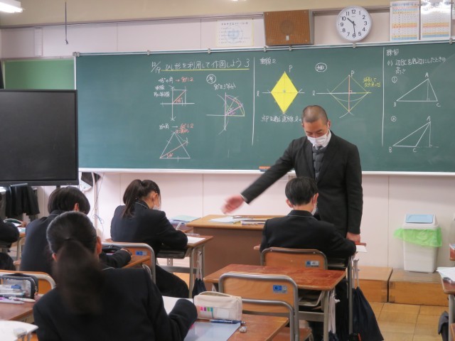 1年生の数学の授業のようすです。「ひし形の性質を利用して垂線や角の二等分線を作図しよう」というめあてで学習を進めていました。コンパスと定規があれば、いろんな場所に垂線を引くことができました。自分の考え方をうまく友だちに伝えることができたかな。みんな作図のすごい力を身につけましたね。