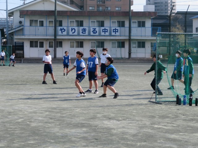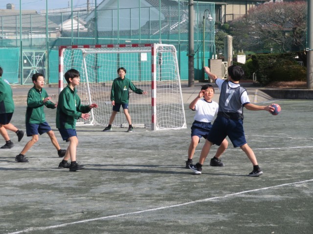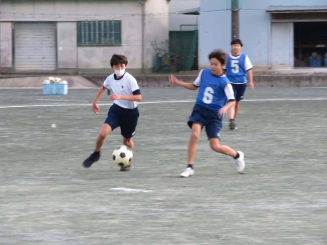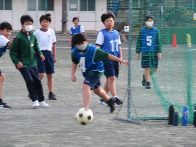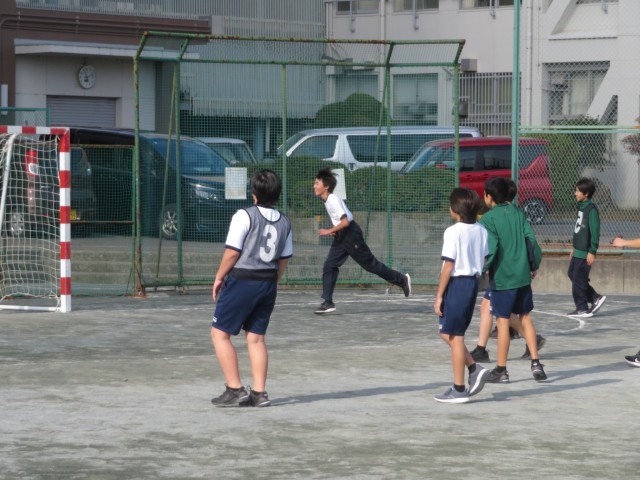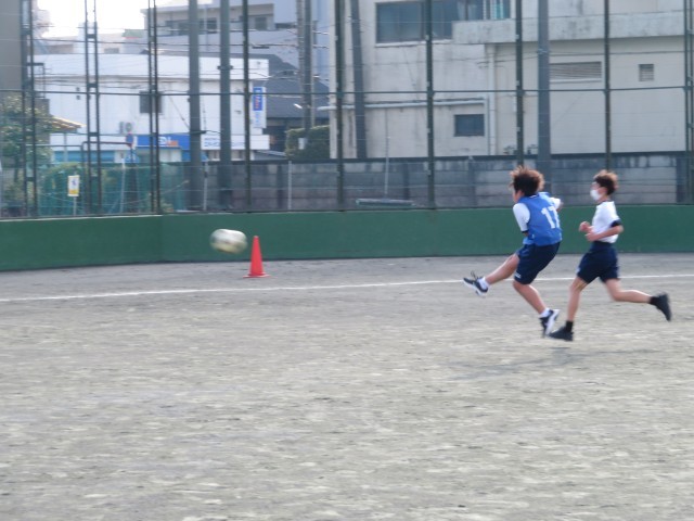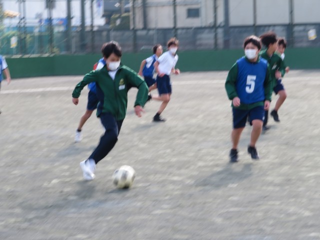 1年生男子の保健体育の授業のようすです。ボール運動で、サッカーとハンドボールに分かれて試合をしていました。ゴールにつながるようにパスやドリブルを組み立てて試合を進められるようにがんばっていましたね。楽しくハッスルプレーしていて気持ちよさそうでした(^^)/