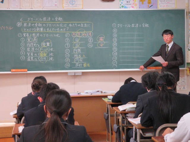 3年生の社会の授業のようすです。今回の授業テーマは、「グローバル化は、私たちの生活にどのような影響を与えているのだろうか」。 一見難しそうなテーマですが、生徒たちは身の回りにある輸入品や、海外展開する日本のサービス、ニュースで耳にする「円安・円高」といった身近な話題から、世界とのつながりを紐解いていきました。