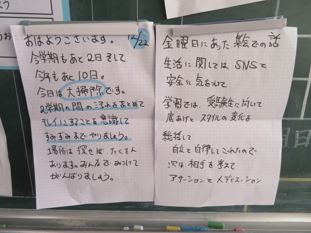 12月22日(月) 大掃除がんばるぞ(^^)/【2年黒板メッセージ】