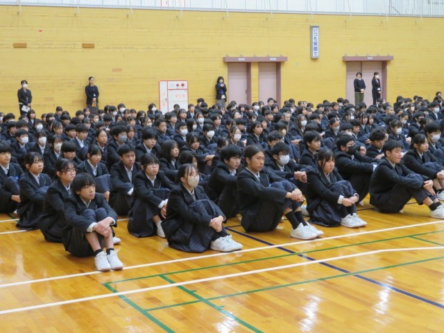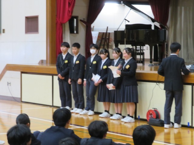 終業式の後、委員会の生徒から冬休みの生活で安全について気をつけてほしいことの発表がありました。動画のクイズを使って分かりやすく呼びかけをしてくれました。けがや事故、心配につながらないように、みんなで安全な行動を心がけて生活していきましょう!