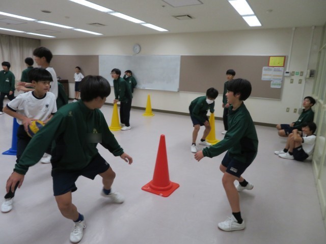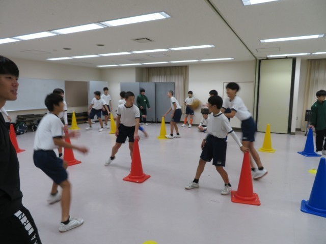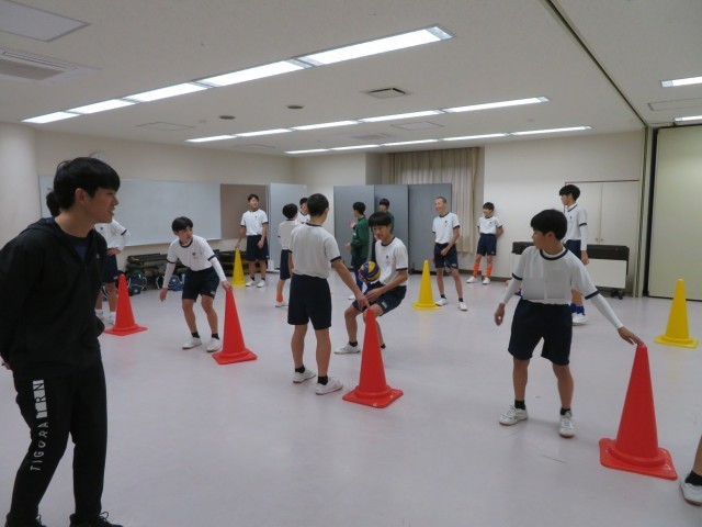 限られた室内スペースで彼らが挑戦していたのは、コーンとバレーボールを使った特殊なメニューです。 バレーボールを使いながら、お互いに「右!」「もっと前!」と激しく声を掛け合います。これは、実際の試合でも不可欠な「コーチング(指示)」の質を高め、瞬時に状況を判断する能力や俊敏性を養うための練習です。