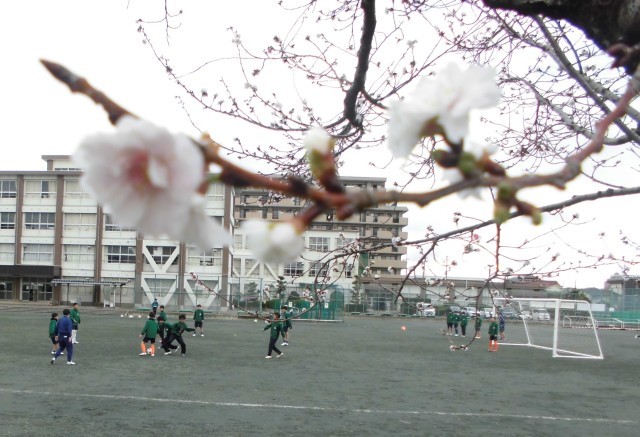 今年はより暖冬の影響がでているのでしょうか…、本校のプール前にある数本の山桜が五分から七分咲きとなっています。そんな桜たちが、グラウンドで活動する生徒たちの様子を見守ってくれています。