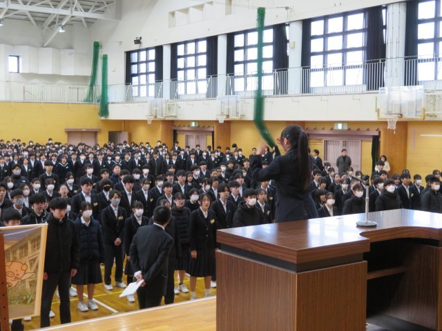 全校でアリーナに集まって、始業式の前に声出しと校歌練習を行いました。とても寒いアリーナでしたが、体と喉をしっかりと温めて、元気よく校歌を歌って3学期をスタートしようとがんばりましたね。