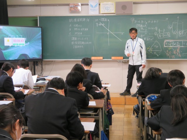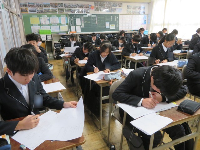 2年生の数学の授業のようすです。3学期はこれまでの学びを振り返って総復習する時期です。いろんな領域の問題を解きながら、力試しをしていました。しっかりと復習して自信を深めることができましたね。