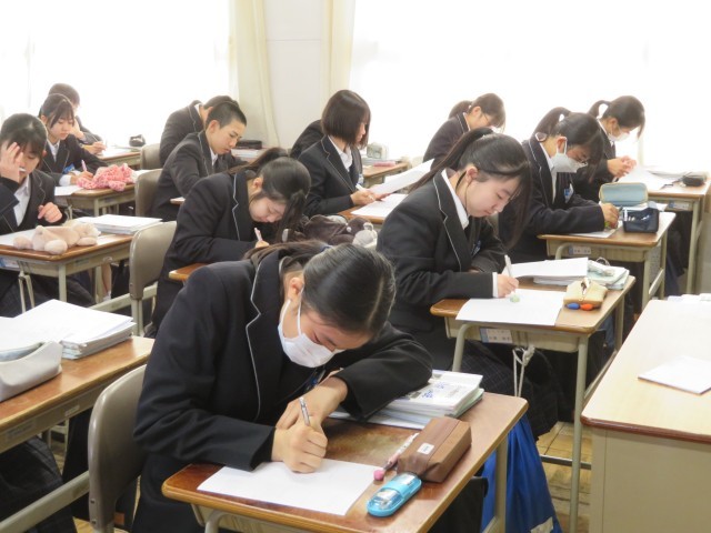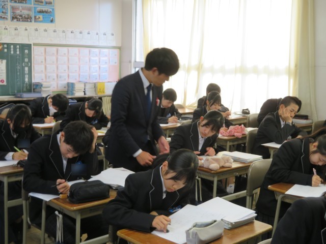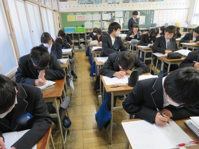 2年生の数学の授業のようすです。「2年生の学習を総復習しよう!」というめあてで、先生プリントに挑戦していました。式の計算や関数、図形など、様々な領域の問題に挑戦して、学びを確認できましたね。集中力がすばらしかったです(^^)/