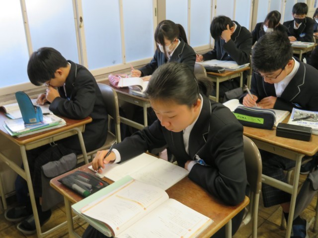 2年生の数学の授業のようすです。教科書の問題を使って、一次関数の問題の特訓をしていました。式を求めたり、グラフで表したり、一次関数の関係を使って文章問題に挑戦したりと、さまざまな問題に取り組んで理解を深めることができましたね。