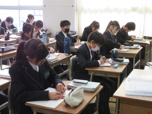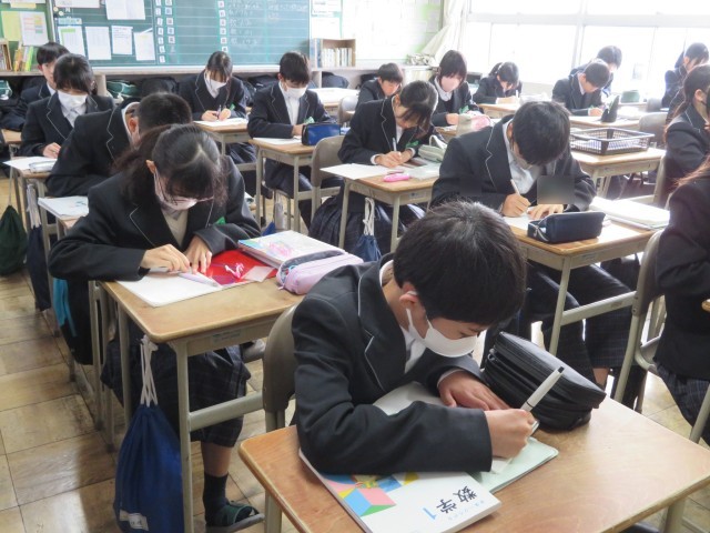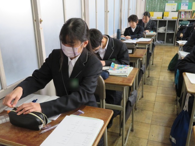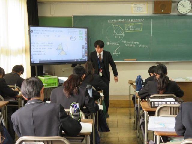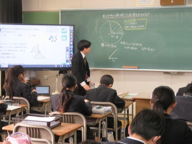 1年生の数学の授業のようすです。「おうぎ形の弧の長さと面積を求めよう」というめあてで学習を進めていました。条件を指定されたおうぎ形の作図をコンパスや分度器を使ってかき表すことができましたね。