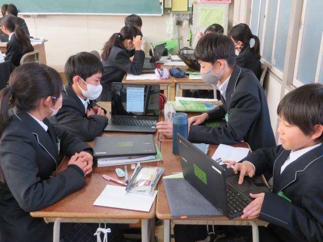 教科書の「冬休みの出来事を伝え合おう」というユニットで学んだ表現を使い、どの子も自分だけのオリジナルな物語を一生懸命に英語で表現していました。