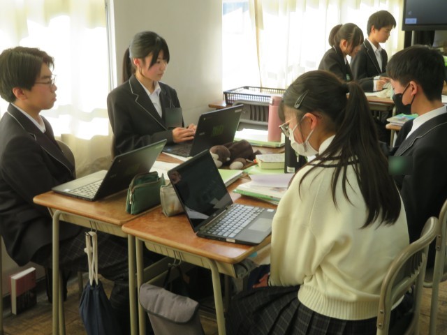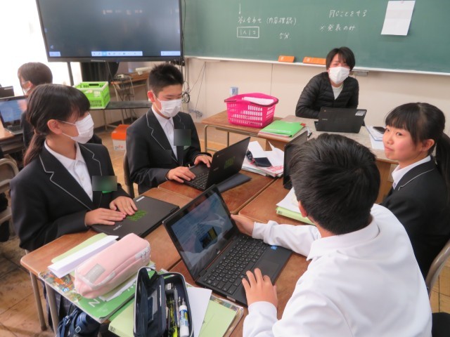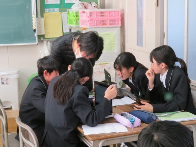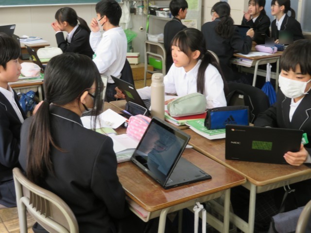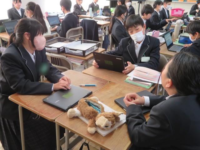 2年生の英語の授業では、ICT端末を活用したスピーキングとライティングの発表会が行われていました。