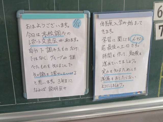 【左側のボード】 おはようございます。 (1/16) 今日は高校調べのレポート交流会があります。 自分で調べたものだけでなく、グループが調べたものを知ることで、知識を増やしていけると思います。 3年生になれば説明会や体験入学が始まってきます。