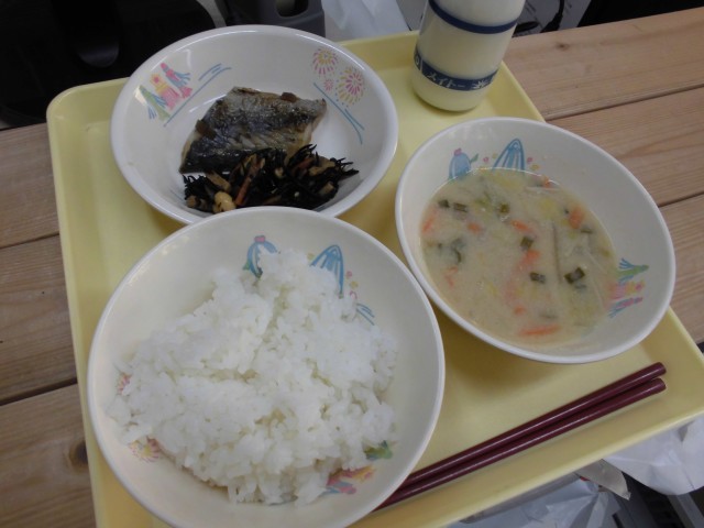 本日の給食は、ご飯、牛乳、さわらの梅だれがけ、大豆の磯煮、豆乳ごまみそ汁です。