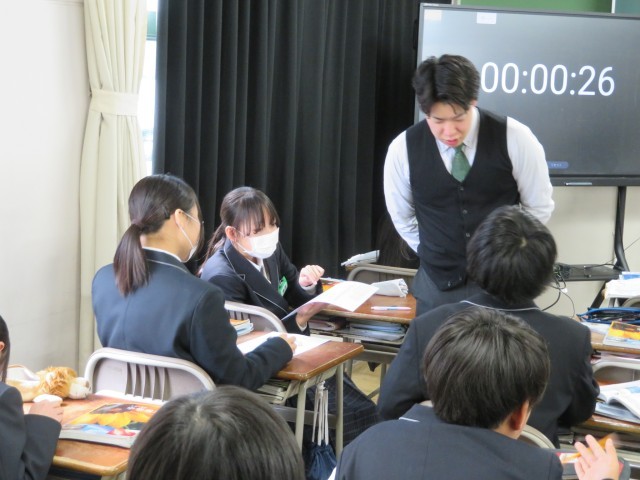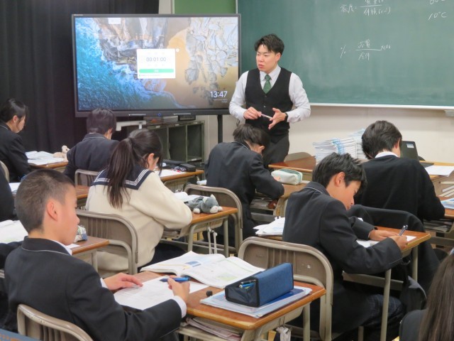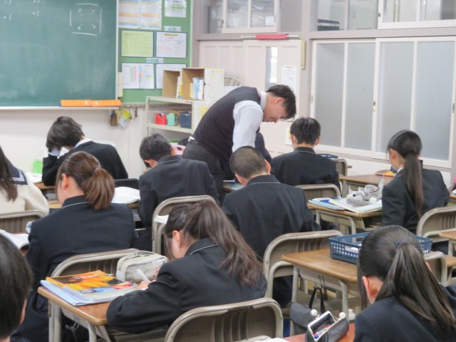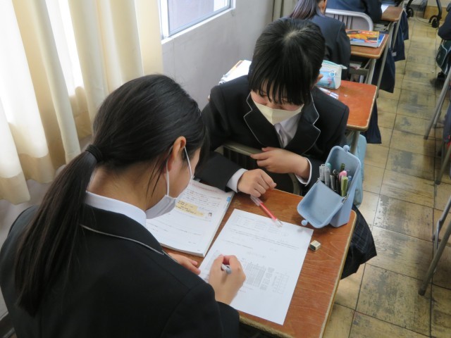 一人でじっくりと問題に向き合う時間もあれば、時には近くの席の友だちと「どうやって解いた?」と解法を確認し合う場面も見られました。教え合いを通じて、自分の理解をより確かなものにしているようです。 分からない箇所があれば先生に質問し、ヒントを得て「あ、分かった!」と表情を明るくする生徒の姿が印象的でした。