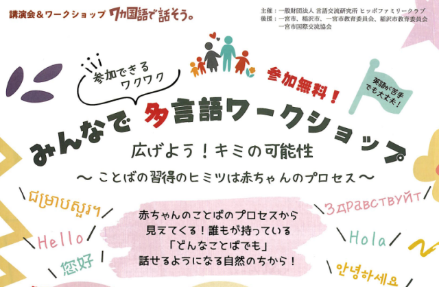 地域の方から「みんなで多言語ワークショップ」のイベントを紹介していただきましたので、HP記事でもみなさんにお知らせします。興味がある人は、チラシを見て参加してみませんか。