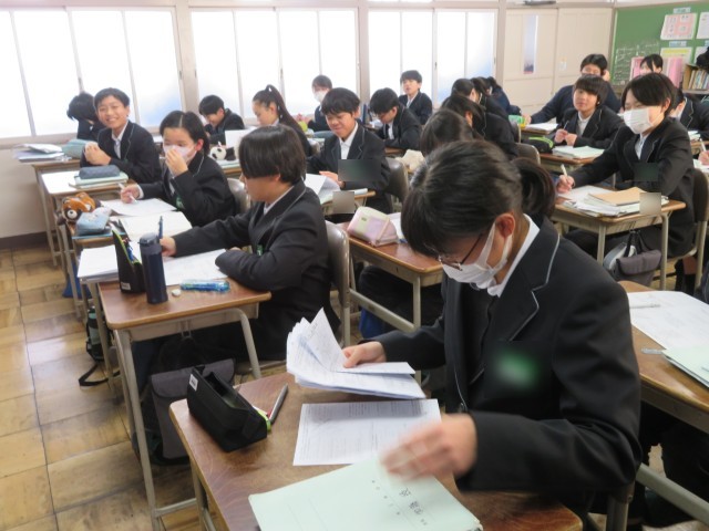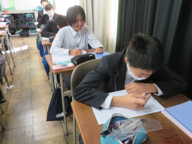 1年生の数学の授業のようすです。「4章の総復習をしよう」というめあてで、関数に関する問題に挑戦していました。たくさん問題を解いて自信を深めることができたかな。