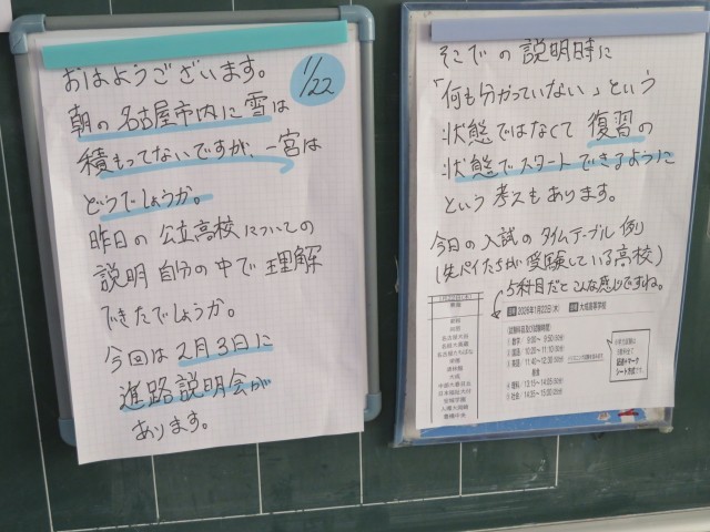 一昨日の公立高校についての説明を受け、担任の先生からは「自分の中で理解できたでしょうか」という問いかけがありました。 次回、2月3日には「進路説明会」が予定されています。 先生のメッセージには、「何も分かっていない状態で聞くのではなく、予習をした上での『復習』として説明を聞けるように準備してほしい」という願いが込められていました。受け身ではなく、自ら情報を掴みに行く姿勢が求められています。