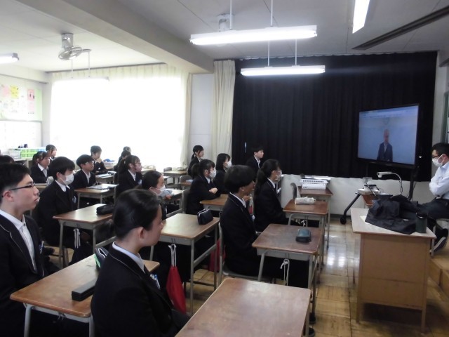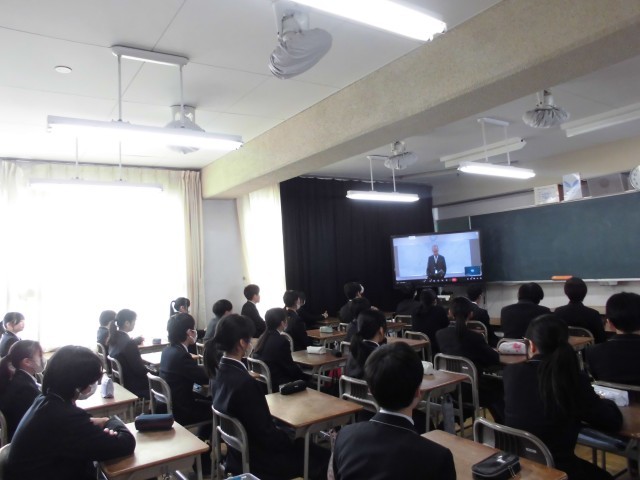 本日のオンライン集会では、校長先生のお話や生徒会からの話を教室で聞きました。オンラインを効果的に活用することで、集中してお話を聞くことができました。