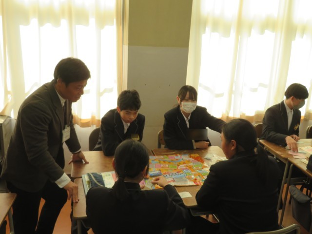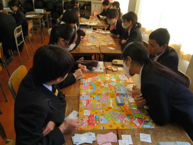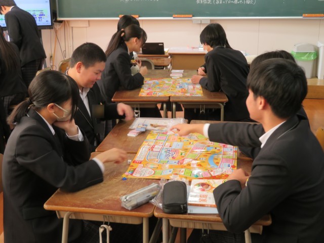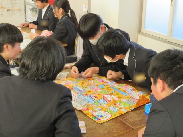 教室を覗くと、グループごとにボードゲームを囲んで盛り上がる3年生の姿がありました。一見遊んでいるように見えますが、実はこれ、立派な家庭科の授業!ゲームを通じて、予期せぬ出費やライフイベントを体験し、100歳までのライフプランをシミュレートしています。難しい資産運用の話も、仲間と相談しながらだと理解が深まりますね。
