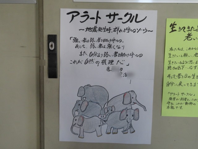 掲示物には、地震などの危険が迫った際、大人の象たちが子供の象を囲んで守る「アラートサークル」の様子が描かれています。これは動物の本能であり、群れ全体で弱い存在を守ろうとする「自然の摂理」でもあります。