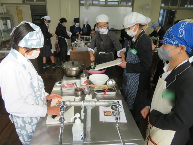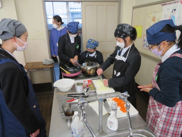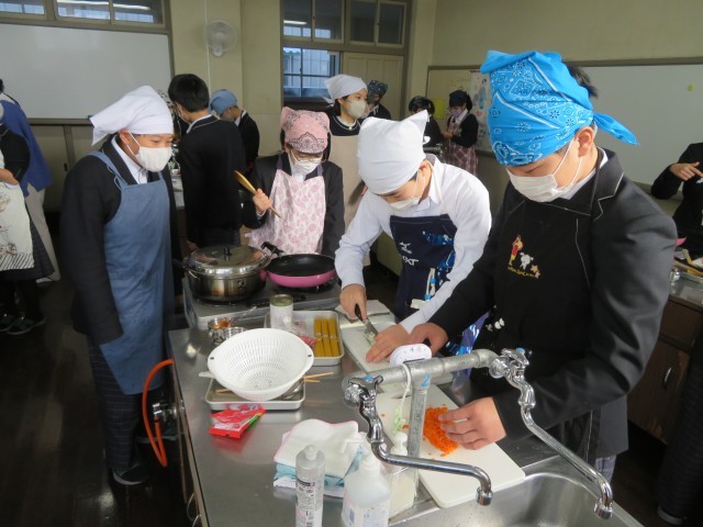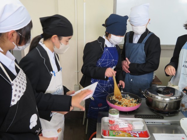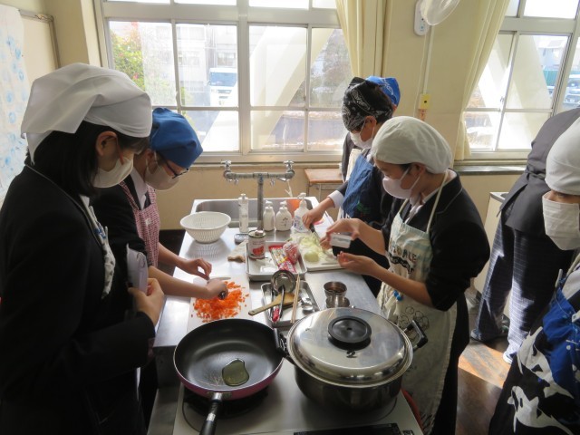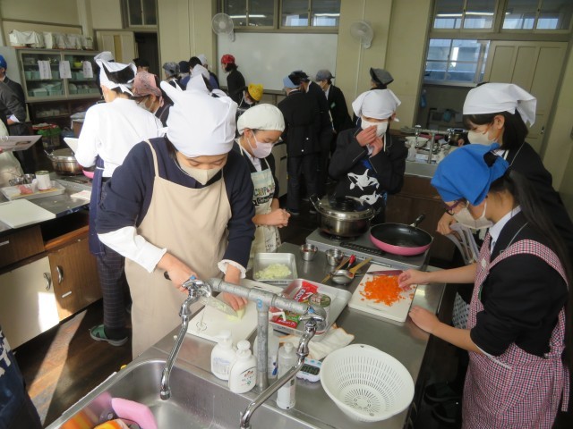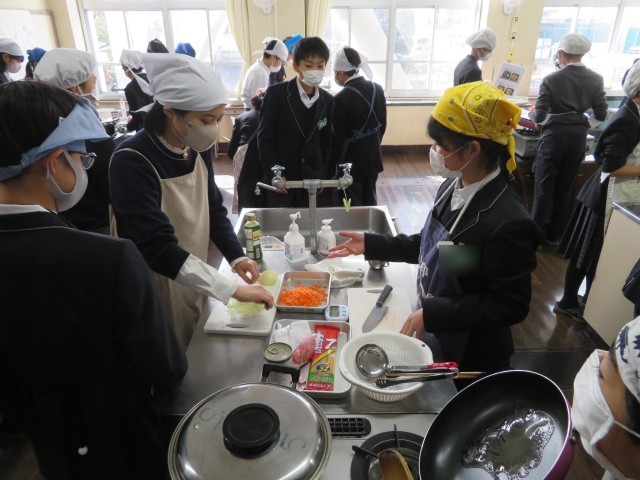 1年生の家庭科の時間に、ミートスパゲティの調理実習を行いました!身支度を整え、手洗いを済ませたら実習スタート。玉ねぎやにんじんを細かく刻む作業では、班の仲間と声を掛け合いながら慎重に包丁を動かしていました。火加減を調整しながらソースを煮込み、パスタが茹で上がると教室中に食欲をそそる良い香りが広がります。