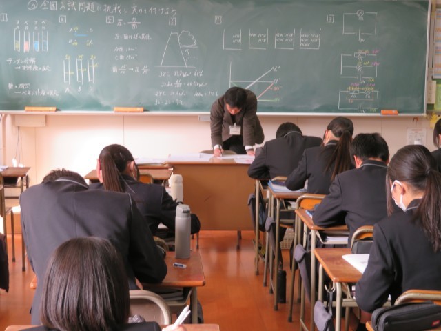 今日の3年生の理科の授業は、いつにも増してピンと張り詰めた空気が流れていました。 黒板に書かれた力強い「めあて」のもと、生徒たちが取り組んでいるのは、全国の公立高校で実際に出題された過去問題です。