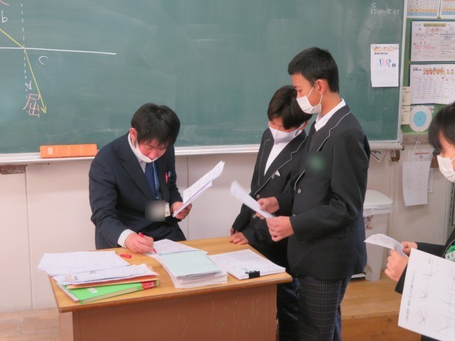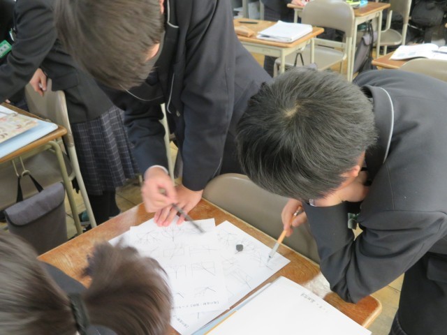 今回のポイントは、ただ答えを出すだけでなく、「なぜ光がその道筋をたどるのか」を、友達に納得してもらえるくらいに理解を深めることです。教室のあちこちでは、プリントを囲んで熱心な議論が交わされていました。 「ここは境界線に対して垂直な線を引いて……」「屈折角はどうなるんだっけ?」と、お互いの考えをぶつけ合い、自分たちの力で正解へと近づいていきます。