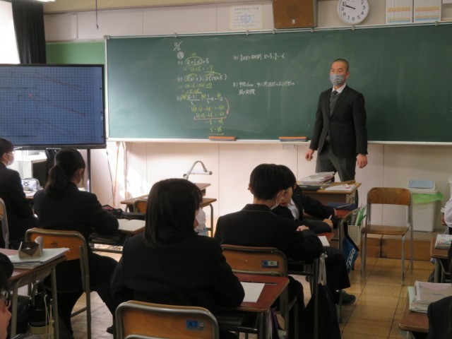 英語の授業と同様に、数学でもこれまでの学習内容を振り返る復習授業が行われていました。黒板には、1年生で学んだ主要な問題が並んでいます。