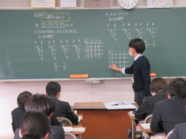 黒板には、樹形図や表が丁寧に描かれています。 「1、2、3、4」のカードからAさんとBさんが順に引くとき、その組み合わせが全部で何通りあるのか、そして「Aさんの方が大きい数字になる確率」はどれくらいか。生徒たちは、図を使いながら論理的に正解を導き出していました。