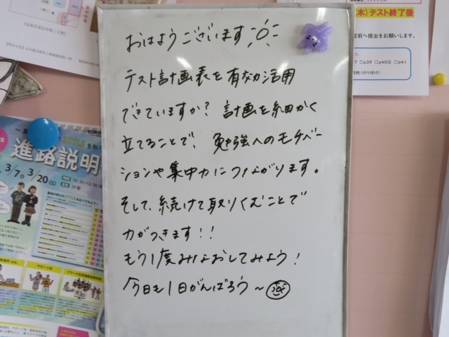 2年生の教室にあるホワイトボード。そこには、担任の先生から生徒たちへ向けた、毎朝の熱いエールが記されています。今日は、テストを控えた皆さんに向けた大切なアドバイスをご紹介します。