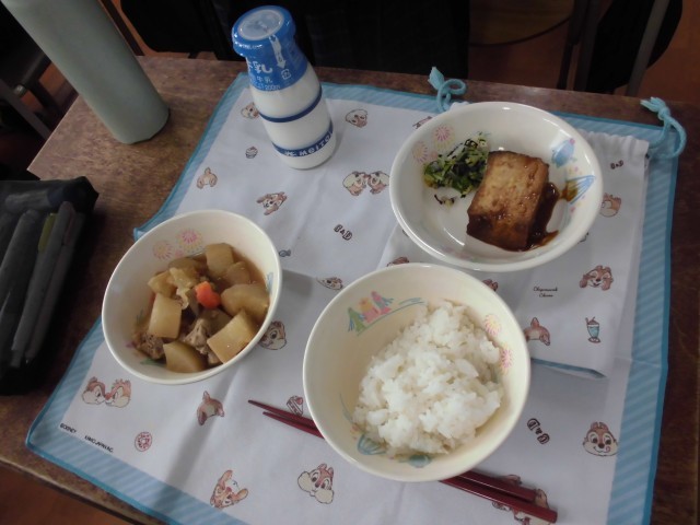 本日の給食は、ご飯、牛乳、関東煮、絹厚揚げの肉みそがけ、赤じそ和えです。