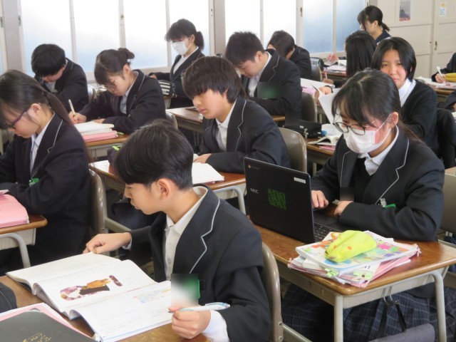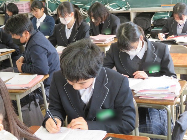 1年生の国語の授業のようすです。学年末テストに向けた復習に取り組んでいました。文章問題の答え直しや漢字・文法の練習など、自分なりに苦手や力を入れたいことを考えて、集中して手と頭を動かしていました。