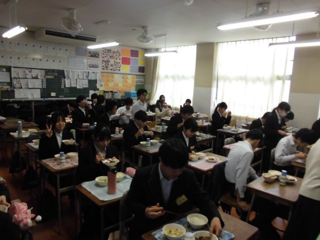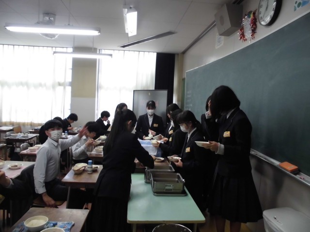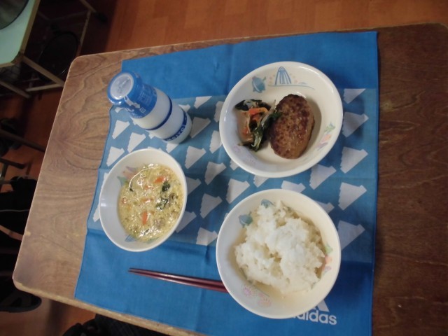 本日の給食は、ご飯、牛乳、ハンバーグの梅おろしがけ、千草和、茶碗蒸しスープです。