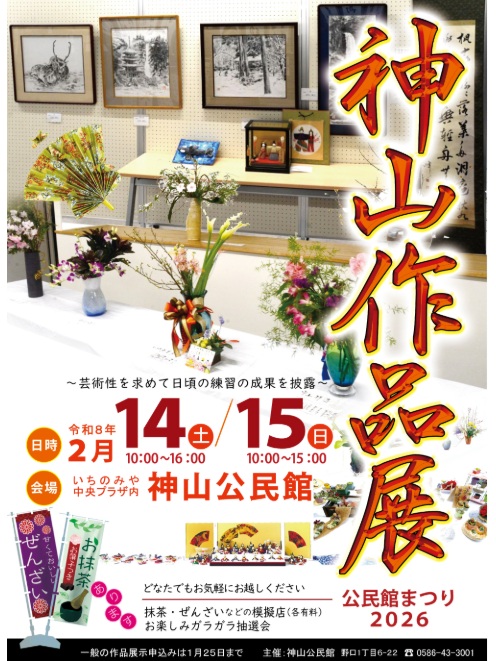 「神山公民館まつり2026」が神山公民館で開催されています。地域のみなさんの作品とともに、中部中学校や神山小学校、末広小学校の児童生徒の作品も展示されています。ぜひ家族や友だちと足を運んでみませんか(^^)/(ちらしは市のHPに掲載されているものです。詳細はチラシでご確認ください)