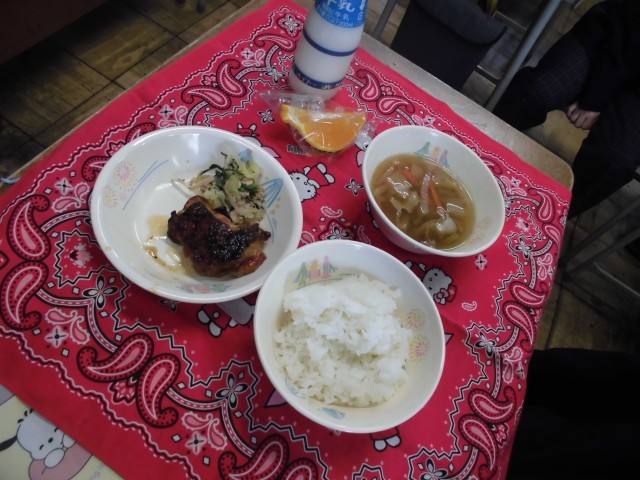 本日の給食は、ご飯、牛乳、てりどり、春菊のツナ和え、冬の根菜汁、しらぬいです。