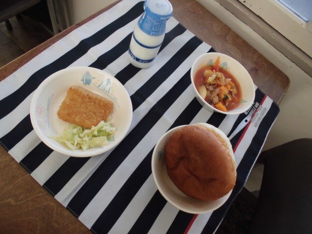 本日の給食は、サンドイッチバンズパン、牛乳、フィッシュバーカー、ミネストローネです。