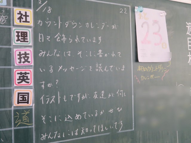 2月18日(水) みんなからのメッセージを受け取って【2年黒板メッセージ】 公開日 2026/02/18 更新日 2026/02/18 人権教育といじめ対策 担任の先生からのメッセージです(^^)/ 2年