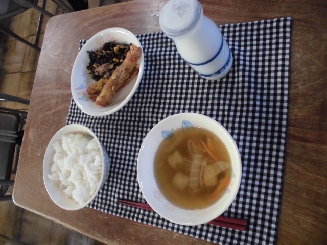 本日の給食は、ご飯、牛乳、ちくわの米粉カレー揚げ、ひじきの炒め煮、鶏団子汁です。