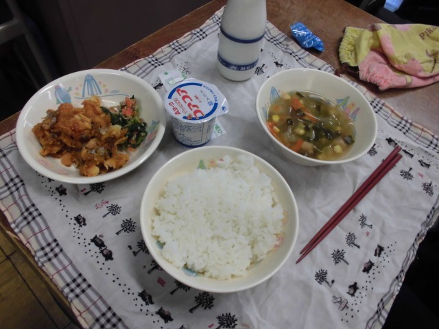 本日の給食は、ご飯、牛乳、ヤンニョムフィッシュ、チンゲン菜の中華和え、はるさめスープ、ヨーグルトです。