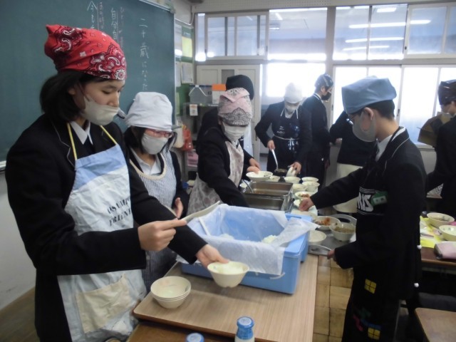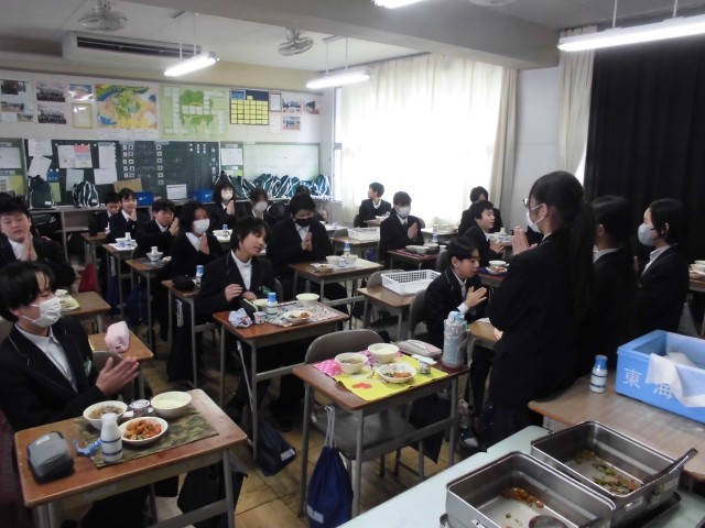 写真は1年生の教室の様子です。いただきますの合掌の前に誕生日の生徒をみんなでお祝いしました。